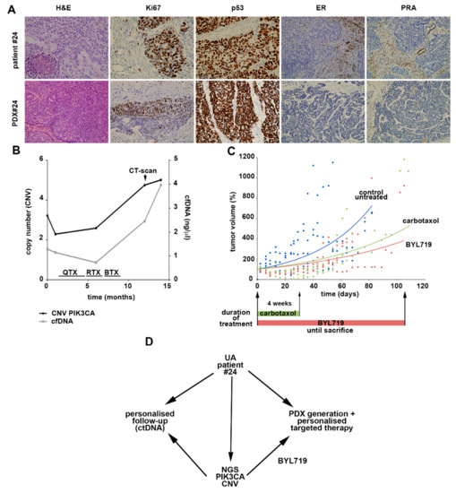 Patient-derived xenograft (PDX) generation from uterine aspirate (UA) of Patient #24 as a preclinical model to test targeted therapies. (A) Comparison of histology and immunohistochemistry between the patient primary tumor and the PDX generated from the UA collected at surgery. (B) cfDNA and ctDNA level dynamics during disease evolution. QTX: chemotherapy; RTX: radiotherapy; BTX: brachytherapy. (C) PDX tumor growth evolution in response to carboplatin/paclitaxel (weekly intraperitoneal injection for 4 weeks, n = 3), BYL719 (daily oral gavage; n = 4), or control (methyl cellulose daily oral gavage; n = 4) treatment. (D) Summary of the combined liquid biopsy strategy to achieve personalized treatment for the patients with EC included in our study.