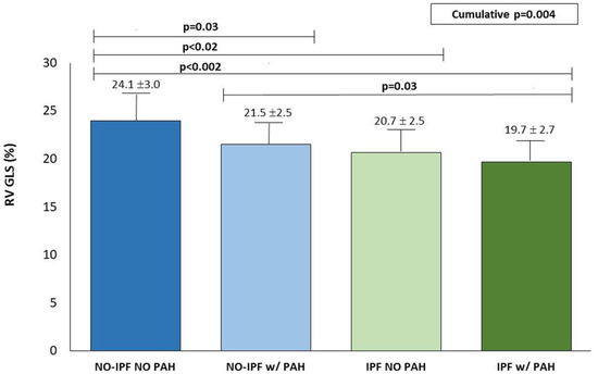 Behavior of RV GLS (mean ± SD) in no-IPF and IPF without and with PAH. RV GLS is significantly lower in IPF with or without PAH in comparison with both no-IPF groups.