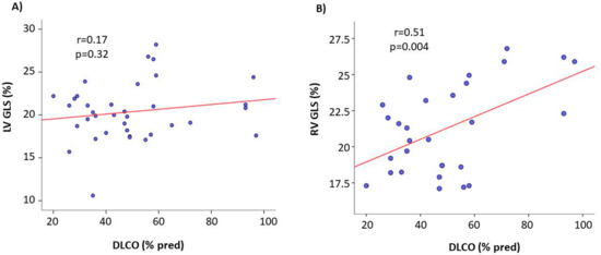 In the pooled ILDs population, DLCOsb was significantly related with RV GLS (r = 0.51, p = 0.004), whereas the relation between LV GLS and DLCOsb was not significant (r = 0.17, p = 0.32) (Figure 2). RV GLS was also negatively related with PASP (r = −0.25, p = 0.02). The relations of RV GLS with pO2 (r = 0.03, p = 0.83), pCO2 (r = −0.26, p = 0.08), FVC (r = 0.04, p = 0.79), and TLC (r = −0.01, p = 0.96) did not achieve statistical significance. Of note, RV EF was not significantly related with any of the spirometric and pulmonary functional parameters. 6-MWT did not correlate with any of the echocardiographic parameters.