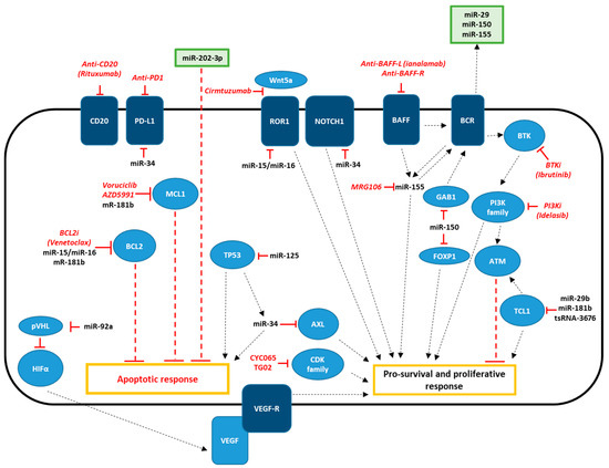 Schematic diagram of effectors, ncRNAs, and drugs involved in CLL therapy. NcRNAs are indicated in black, therapeutic agents are indicated in red. Surface receptors are indicated in dark blue and other effectors are indicated in light blue. Extracellular vesicles are indicated in green.