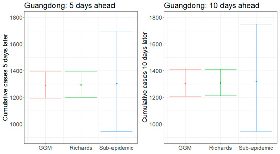 Forecasting results of 5- and 10-day ahead estimates of cumulative reported case counts for Guangdong, China, generated on 13 February 2020. The dots are the mean estimates for each model, and the hinge lines represent the 95% prediction intervals.