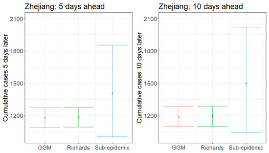 Average 5-day forecasts from the GLM and Richards model are nearly equivalent for Zhejiang (1181 and 1186, respectively), while the sub-epidemic model predicts an average of 1405 cumulative cases (Figure 2). The sub-epidemic model also has significantly higher upper bounds, suggesting the possibility of up to 1853 cases, while the GLM and Richards only predict up to 1276 and 1279, respectively. As of 13 February 2020, Zhejiang has a total cumulative reported case count of 1145 [1]; therefore, the models are predicting an additional 36–260 cases in the next five days (UB: 131–708).