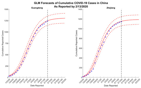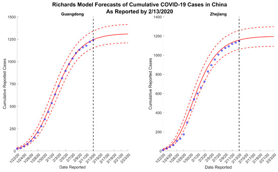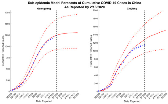 The following are available online at https://www.mdpi.com/2077-0383/9/2/596/s1, Table S1: Initial parameter estimates and estimation bounds for the model fitting process to calibrate each of the models to the data reported up until 13 February 2020, Table S2: Guangdong: GLM, Richards, and sub-epidemic model parameter estimates, mean squared error (MSE) for the best-fit solution, and prediction interval (PI) coverage, Table S3: Zhejiang: GLM, Richards, and sub-epidemic model parameter estimates, mean squared error (MSE) for the best-fit solution, and prediction interval (PI) coverage.