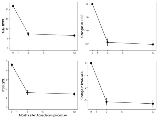 Absolute (y-axis) and change (y-axis) in International Prostate Symptom Score (IPSS) and IPSS QOL. Population means are shown at the left and score changes at the right. Months after Aquablation procedure is the y-axis in all graphs.