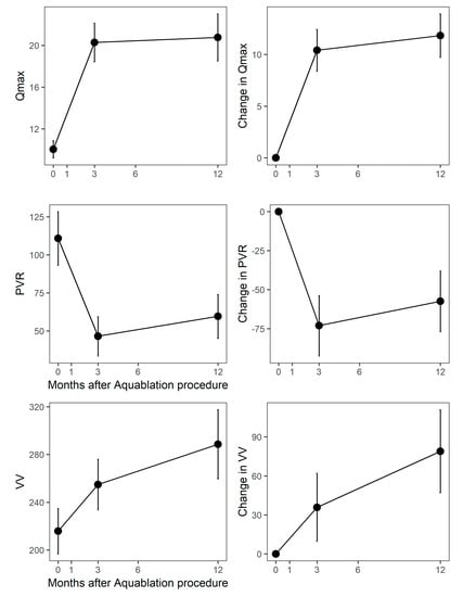 Absolute (y-axis) and change (y-axis) in uroflow parameters after Aquablation. Qmax = maximal urinary flow rate; PVR = post-void residual; VV = voiding volume. Population means are shown at the left; change from the baseline is shown at the right. Months after Aquablation procedure is the y-axis in all graphs.