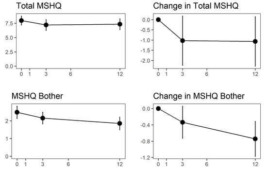 Amongst 92 men who were sexually active at both the baseline and the 12-month follow-up study visit, MSHQ-EjD score changed by −1 point at 3 months (p = 0.0994) and by −1.1 points at 12 months (p = 0.0884), Figure 3. MSHQ bother changed by −0.3 and −0.7 points at 3 and 12 months (p = 0.0962 and 0.0025). IIEF-15 subdomain scores remained stable throughout month 3, Figure 4.