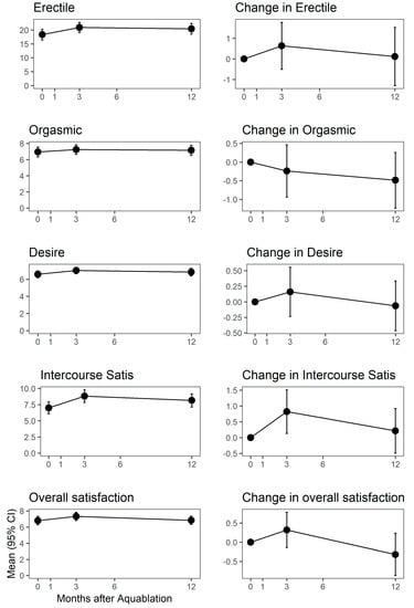 Absolute (y-axis) and change (y-axis) in sexual function scores from the baseline to month 12. Top two plots are MSHQ-Ejd score and bother score. Bottom five plots are IIEF-15 subdomains. Months after Aquablation procedure is the y-axis in all graphs.