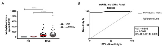 (A) Distribution of VIMme and miR663ame levels in normal bladder mucosae (NB; n = 19) and bladder carcinoma (BlCa; n = 94) tissue samples. Mann-Whitney U test, **** p < 0.0001. Median is represented by the red line. (B) Receiver operator characteristic (ROC) curve evaluating the performance of the VIMme-miR663ame panel for the identification of BlCa in tissue samples. (AUC—Area under the curve; CI—Confidence interval; ACTB—Beta-Actin; VIM—Vimentin).