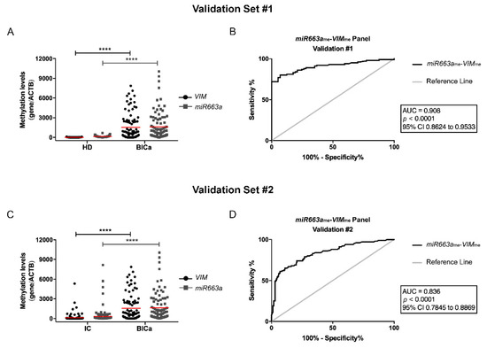 (A) Distribution of VIMme and miR663ame levels in the Validation Cohort #1, composed by healthy donors (HD; n = 57) and bladder carcinoma (BlCa; n = 100) urine samples. Mann-Whitney U (MW) test, **** p < 0.0001. Median is represented by the red line. (B) Receiver operator characteristic (ROC) curve evaluating the performance of the VIMme-miR663ame panel for the identification of BlCa in urine samples of the Validation Cohort #1. (C) Distribution of VIMme and miR663ame levels in the Validation Cohort #2, composed by inflammatory controls (IC; n = 174) and bladder carcinoma (BlCa; n = 100) urine samples. MW test, **** p < 0.0001. (D) ROC curve evaluating the performance of the VIMme-miR663ame panel for the identification of BlCa in urine samples of the Validation Cohort #2. (AUC—Area under the curve; CI—Confidence interval; ACTB—Beta-Actin; VIM—Vimentin).