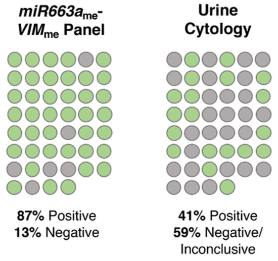 Representation of the percentage of bladder cancer (BlCa) cases correctly identified with the VIMme-miR663ame panel and a standard urine cytology analysis. Green circles represent positive cases, grey circles represent negative/inconclusive cases.