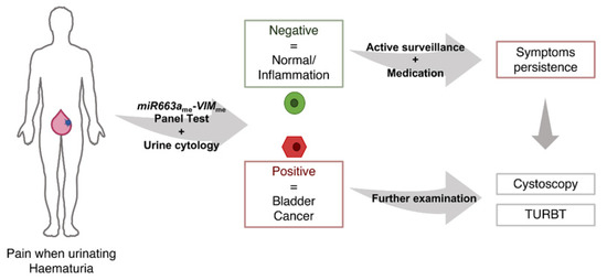 Although urine cytology and UroVysionTM fluorescence in situ hybridization (FISH) assay are the two most commonly used urine-based tests in daily practice, they present important limitations. On one hand, UroVysionTM presents a not-negligible rate of false positive results; on the other hand, urine cytology has limited accuracy, especially in low grade tumours detection [6,31,32]. Although no direct comparison can be done with UroVysionTM, the 91.6% PPV obtained for the multiplex panel clearly demonstrates higher accuracy in identifying true positive BlCa cases. In the present study, urine cytology reached 41% sensitivity, which was easily surpassed by the 86% displayed by miR663ame-VIMme multiplex panel. Notwithstanding, urine cytology remains an easy-to-perform and informative test, as it allows pathologists to have the first look at exfoliated neoplastic cells in urine. Having that in mind, we propose an algorithm where a urine cytology and the miR663ame-VIMme multiplex panel could be combined as first-line diagnostic tests in patients with common urinary complaints, with the ultimate goal of reducing the number of unnecessary cystoscopies, which are invasive, uncomfortable and costly procedures (Figure 5).