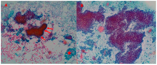 Basal cell cacinomas (BCCs). (A) Superficial basal cell carcinoma (sBCC): presence of two fragments composed of tightly packed small cells with mild atypia, peripheral palisade (red arrows), absence of dehiscence, and one cluster of clear sebaceous cells (red star) (Papanicolaou stain, ×100). (B) Non-superficial basal cell carcinoma (nsBCC): cellular smear with large clusters of basal cells with dehiscence and severe grade of atypia (Papanicolaou stain, ×200).