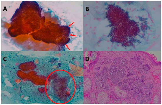 BCCs. (A) Cytology revealed large clusters of basal cells, mucin, and peripheral cells arranged in palisades (red arrows) (Papanicolaou stain, ×100). (B) Cytological image with a fragment composed of small basal cells with uniform oval, dark nuclei (Papanicolaou stain, ×200). (C) Group of basal cells accompanied by a stromal fragment (red circle) and keratinized squamous cells (Papanicolaou stain, ×100). (D) On histology, BCC showed a lobular pattern with islands and basaloid cells (hematoxylin and eosin, ×40).