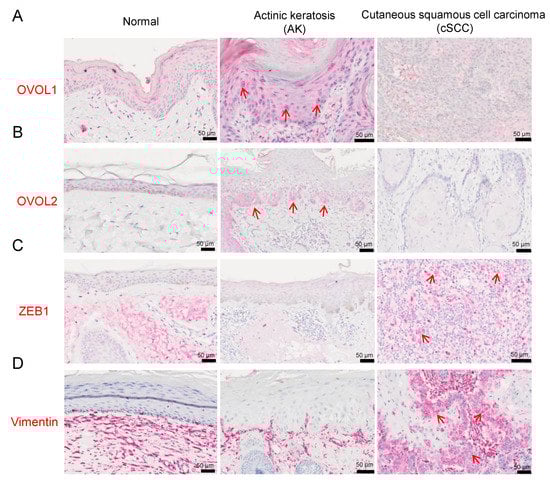 Representative images of ovo-like transcriptional repressor 1 (OVOL1) and ovo-like zinc finger 2 (OVOL2), zinc finger E-box binding homeobox 1 (ZEB1), and vimentin staining in normal skin (left), actinic keratosis (AK) (middle) and cutaneous squamous cell carcinoma (cSCC) (right). (A) Representative images of OVOL1 staining, (B) OVOL2 staining, (C) ZEB1 staining, and (D) vimentin staining. Red arrows show the positive cells.