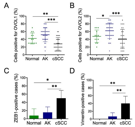 GraphPad Prism version 8 (GraphPad Software, San Diego, CA, USA) was used for all statistical analyses. We used Fisher’s exact test to analyze the relationship between OVOL1/2 expression and ZEB1 or vimentin expression in AK and cSCC tissues. We collected quantitative data from at least three independent experiments and measurements. The results are expressed as mean ± standard deviation. We determined differences between groups by the Mann–Whitney U-test. A p-value < 0.05 was assumed to indicate a statistically significant difference; * p < 0.05, ** p < 0.01, and *** p < 0.001.