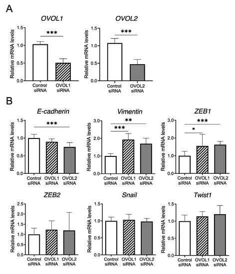 Vimentin and ZEB1 mRNA levels are regulated by OVOL1/2 knockdown in a human SCC cell line. (A) Relative mRNA levels of OVOL1 and OVOL2 in A431 cells treated with control siRNA, OVOL1 siRNA, or OVOL2 siRNA for 48 h. (B) Relative mRNA levels of E-cadherin, vimentin, ZEB1, ZEB2, Snail, and Twist1 in A431 cells treated with control siRNA, OVOL1 siRNA, or OVOL2 siRNA for 48 h. Mann–Whitney U-test; error bars represent mean ± standard deviation. For interpretation purposes, the control siRNA value was set to 1. p-values < 0.05 were assumed to indicate a statistically significant difference; * p < 0.05, ** p < 0.01, and *** p < 0.001. Assays were conducted in triplicate and repeated at least three times in separate experiments.