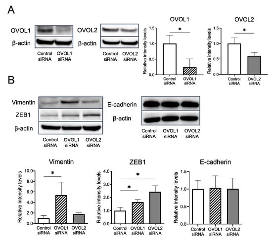 Vimentin and ZEB1 protein levels are regulated by OVOL1 and OVOL2 in a human SCC cell line. (A) Relative protein expression levels of OVOL1 and OVOL2 in A431 cells treated with control siRNA, OVOL1 siRNA, or OVOL2 siRNA for 48 h. (Left) Representative blot images and (right) relative expression levels calculated from three independent experiments. (B) Relative protein expression levels of vimentin, ZEB1, and E-cadherin in A431 cells treated with control siRNA, OVOL1 siRNA, or OVOL2 siRNA for 72 h. (Upper) representative blot images and (lower) relative protein expression levels calculated from three independent experiments. Mann–Whitney U-test; error bars represent mean ± standard deviation. Protein expressions are relative to those of β-actin as a reference. The control siRNA value was set to 1. p-values < 0.05 were assumed to indicate a statistically significant difference; * p < 0.05.