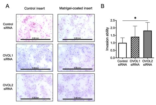 OVOL2 regulates invasion ability in a human SCC cell line. (A) Representative images, and (B) relative invasion ability of cells. A431 cells were transfected with control siRNA, OVOL1 siRNA, or OVOL2 siRNA and cultured in Transwell plates. Cells that translocated through control inserts or invaded Matrigel-coated inserts are stained on the membrane. Scale bar = 0.50 mm. Mann–Whitney U-test; error bars represent mean ± standard deviation. For interpretation purposes, the control siRNA value was set to 1. p-values < 0.05 were assumed to indicate a statistically significant difference; * p < 0.05. Assays were conducted in triplicate and repeated at least three times in separate experiments.