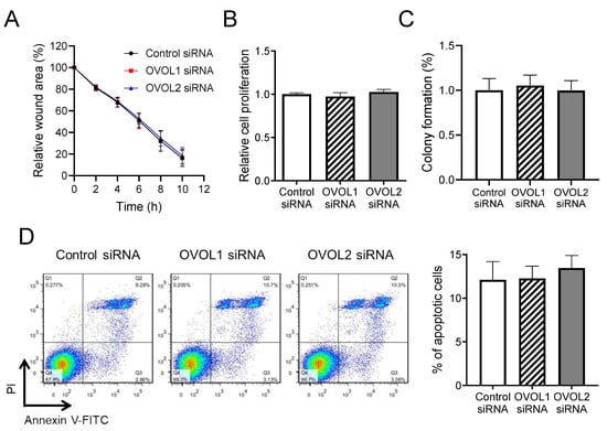 OVOL1/2 do not regulate wound healing, proliferation, colony formation, or apoptosis in a human SCC cell line. (A) A431 cells were transfected with control siRNA, OVOL1 siRNA, or OVOL2 siRNA and submitted to a wound healing assay. Forty-eight hours post-transfection, cell monolayers were scratched and tracked for cell migration until 10 h post-scratching. A representative result is shown. (B) Cell proliferation was examined in siRNA-transfected cells using the WST-1 assay 48 h post-transfection. (C) The colony-forming ability of siRNA-transfected cells was assessed using the semi-solid agar and MTT assay. (D) The apoptotic status of siRNA-transfected cells was evaluated by propidium iodide–Annexin V staining and measured by flow cytometry. (Left) Representative flow cytometric images and (right) the percentages of apoptotic cells in all populations. Mann–Whitney U-test; error bars represent mean ± standard deviation. p-values < 0.05 were assumed to indicate a statistically significant difference. All of the experiments were independently repeated at least three times.