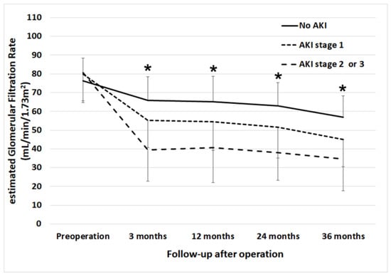 Serial change in mean estimated glomerular filtration rate before surgery to three years after surgery according to the stages of acute kidney injury. * Significant difference between groups.