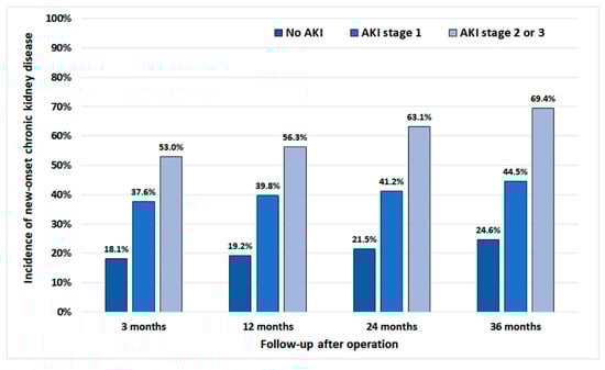 Comparison of the cumulative incidence of chronic kidney disease (estimated glomerular filtration rate (eGFR) <60 mL/min/1.73 m2) at follow-up time points between the patients without acute kidney injury (AKI), those with stage 1 AKI, and those with stage 2 or 3 AKI. There were significant differences in the incidence of chronic kidney disease at all time-points.