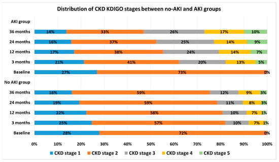 Comparison of the distribution of the Kidney Disease: Improving Global Outcomes chronic kidney disease (KDIGO CKD) stages during the follow-up period of 36 months between the patients with and without AKI after radical nephrectomy.