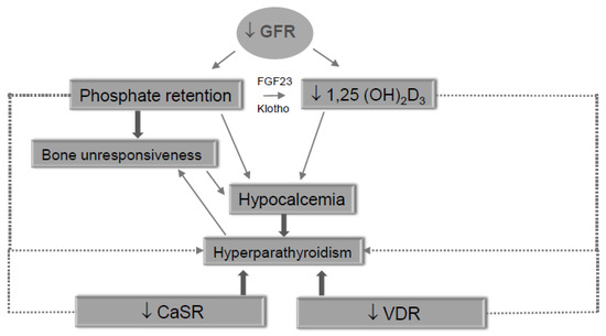 Secondary hyperparathyroidism (SHPTH) is a universal complication of chronic kidney disease (CKD) affecting more than 80% of hemodialysis patients [1,2]. This complication is particularly relevant since CKD is already burdened by a significant cardiovascular risk increase and quality of life worsening [3]. Pathophysiologic mechanisms leading to SHPTH start in early CKD stages and increase in direct correlation with renal function loss [4,5,6]. Decreased active Vitamin D production, hypocalcemia and hyperphosphatemia are common alterations in CKD and represent a continued trigger on parathyroid glands to increase iPTH production. Additional factors contribute as well [7]. The persistence of these triggers leads to a progressive reduction of calcium-sensing receptors (CaSR) and vitamin D receptors (VDR) expression in parathyroid glands preluding to irreversible parathyroid gland hyperplasia onset [8] (Figure 1). This histological change is particularly relevant since patients on hemodialysis with tertiary hyperthyroidism are more likely to develop cardiovascular events and bone fractures with quality of life worsening and increased healthcare costs and mortality [2]. In SHPTH, in fact, normal calcium deposition in bone tissue is diverted into vascular wall inducing atherosclerosis worsening [9].