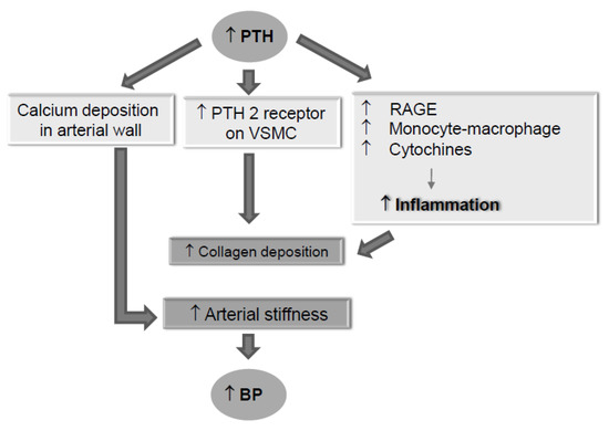 The suspicion for the existence of a pathophysiological relationship between hyperparathyroidism and blood pressure increase has far-away origins. In 1996, Goldsmith et al. published the results of a study conducted on 21 hypertensive hemodialysis patients with tertiary hyperparathyroidism that had undergone parathyroidectomy (PTX) [16]. Interestingly, after the surgical procedure, BP values were significantly reduced together with mean plasma calcium levels and mean heart rate. However, post-surgery iPTH decrease was not followed by a prompt BP normalization, that was instead observed a few months later. Consequently, Goldsmith et al. hypothesized that this effect was linked to a long-term corporeal re-arrangement of calcium distribution. This hypothesis has been sustained and confirmed by other authors describing a mechanism by which, following the post-surgery iPTH lowering, the removal of calcium from the vessel walls might explain a blood pressure improvement related to vessel stiffness reduction [20]. Several other recent studies investigating this important issue have also reported direct iPTH effects involved in vascular stiffness. Specifically, iPTH stimulates PTH2 receptors expressed on vascular smooth muscle cells with a consequent increase of collagen production [19]. Other iPTH related pro-atherosclerosis mechanisms have been also described. They involve an increase in both receptors of advanced glycation end products (RAGE) expression and monocyte-macrophages cytokines and IL-6 production [21] (Figure 2). Interestingly, other reports have evidenced that iPTH is also able to influence both contractile and chronotropic activity of myocardial cells. Specifically, high blood iPTH levels induce ventricular hypertrophy accompanied by a reduction of myocardial contractility and an increase in heart rate [22,23]. A hypertensive role of up-regulated FGF23 in response to hyperphosphatemia in SHPTH patients has also been supposed. In fact, besides the known contribution of FGF23 to calcium deposition in the vascular wall [24], an important mechanism leading to FGF23-related blood pressure increase has been described by Andrukhova et al. They reported that the up-regulating influence of FGF23 on Na+-Cl− transporter expression in convoluted distal tubule is at the basis of a sodium-retentive hypertensive mechanism [25].