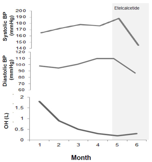 Unrelated blood pressure response to dry weight reduction in our patient before starting Etelcalcetide. OH: overhydration at body composition monitoring (BCM).