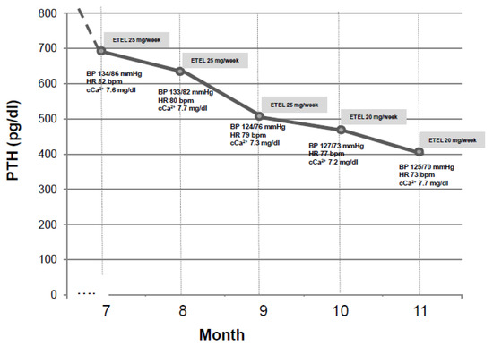 We recently experienced the effect of Etelcalcetide on blood pressure in a 37 years old young male patient on chronic hemodialysis in the past three years. This patient was complicated with SHPTH in treatment with Cinacalcet 30 mg/die (orally administered by the nurse at the end of each dialysis session) and had baseline iPTH 421 pg/mL. At the time, his home therapy also included Lanthanum carbonate 1 g twice/day, Irbesartan 150 mg/day and Omeprazole 20 mg/day. So far, blood pressure was well controlled and stable during hemodialysis sessions. In January 2018, a sudden increase in intradialytic blood pressure and heart rate (mean systolic blood pressure was 190/110 mmHg and mean heart rate was 110 bpm) was accompanied by a significant increase in iPTH, (peak value was 1200 pg/mL). An electrocardiogram and an echocardiogram were performed at that time, not showing any noteworthy change except for a sinusal tachicardia and previously known ventricular hypertrophy. The uncontrolled hypertension was resistant to both pharmacological therapy increase (Amlodipine 10 mg/day, Clonidine TTS 2.5 mg/week were consecutively added) and dry weight reduction according to bioimpedentiometry results (Figure 3). Anti-RAAS agents were not added because of the tendency to hyperkalemia [42,43]. After tertiary hyperparathyroidism was excluded by a Technetium 99m-MIBI-SPECT scan, Cinacalcet was discontinued and Etelcalcetide was started at the standard dose of 5 mg to be administered intravenously at the end of each dialysis session. This dose was thereafter increased to a maximum of 7.5 mg three times per week. In the following six months, we assisted to a progressive and synchronous blood pressure and heart rate normalization and a significant iPTH reduction to baseline values (see Figure 4). This is an anecdotic case increasing the evidence for a cross-link between hypertension and SHPTH and indicating a possible synergistic hypotensive effect by Etelcalcetide in our patient. It would be important to clarify if this effect is ubiquitous in patients treated with Etelcalcetide and the underlying mechanisms.