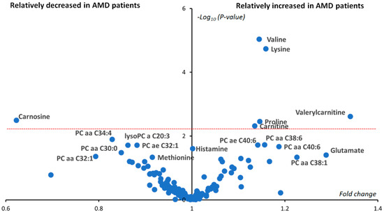 Univariate volcano plot (fold changes versus −log10(p-values)). Only significant metabolites have been labeled. After applying Benjamini–Hochberg correction, six metabolites (valine, lysine, proline, carnosine, carnitine and valerylcarnitine) situated above the dashed red line were still significantly different between the two groups. Phosphatidylcholines have been labeled as a PC aa (diacyl) or PC ae (alkyl-acyl). The number before the colon indicates the length of the two acyl chains, while the number after the colon indicates the sum of the chains’ unsaturation.