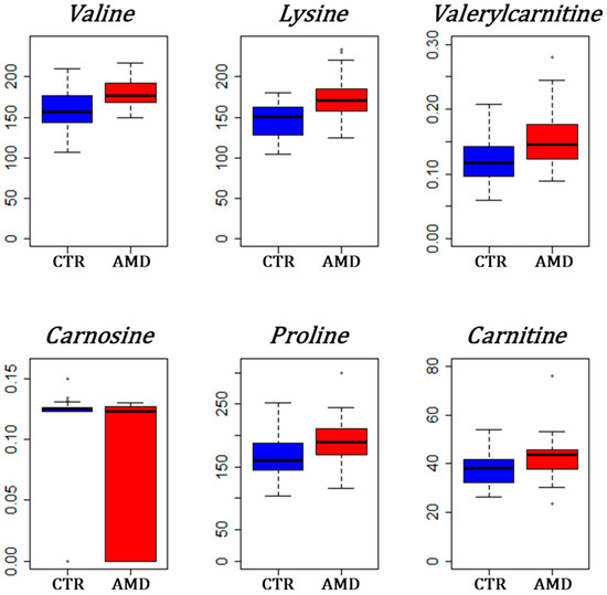 Box plots for the most significant metabolites between AMD and controls (CTR). Groups are represented on the x-axis with the blue box used for controls and the red box for AMD patients. Concentrations are in the y-axis and have dimension μmol/L. The high height of the red box below the median value for carnosine is explained by the high frequency of zero values in the AMD group.