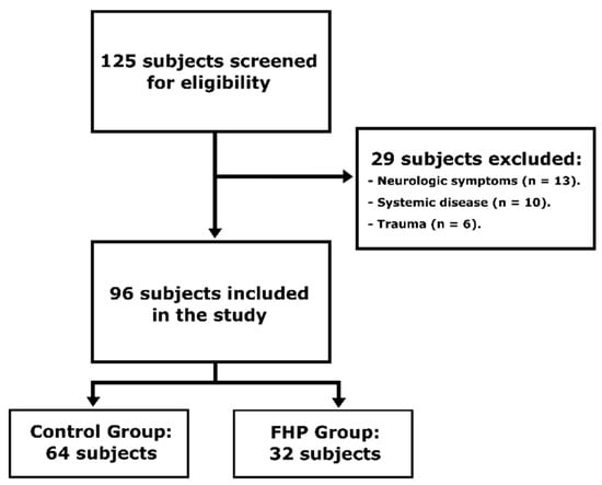The final sample was composed of 96 subjects (Figure 1): 64 controls with a mean age of 19.48 (SD, 1.96) years and 32 cases with a mean age of 20.53 (SD, 2.96) years. The mean CCA was 52.30° (3.00°) in the control group and 44.63° (4.20°) in the FHP group. Demographic characteristics of the subjects are presented in Table 1.