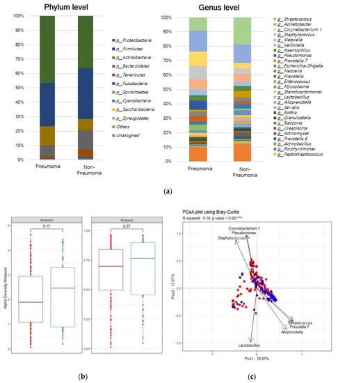 The species richness was similar in the pneumonia and non-pneumonia groups, as shown by the Shannon index (p = 0.24) and Simpson index (p = 0.37). The β-diversity determined by PCoA differed significantly between the two groups (Figure 1b, Adonis p = 0.001). LEfSe analysis revealed 14 discriminating taxa. At the genus level, Pseudomonas, Corynebacterium, Veillonella, Rothia, Enterococcus, and Neisseria predominated in the pneumonia group; Streptococcus, Prevotella, Alloprevotella, Granulicatella, and Mycoplasma predominated in the non-pneumonia group.