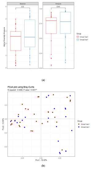 Biodiversity and community similarity analyses were performed using MD healthcare (Seoul, South Korea). Microbial community comparisons were performed using Quantitative Insights in Microbial Ecology software (QIIME, v. 1.8) and the R package Vegan [11]. To test for significant associations, the Mann–Whitney U test was used for continuous variables, and the chi-squared test was used for categorical variables. The α-diversity of the microbiota was measured by calculating the Shannon diversity index and the Simpson index. The β-diversity index was defined as the extent of similarity between microbial communities based on the degree of shared structure. The principal coordinates analysis (PCoA) was based on the Bray–Curtis similarity matrix of the square-root-transformed relative abundance of bacterial genera. Adonis tests were performed to confirm the differences between groups, and logistic regression was used to assess differences in the change in principal coordinates between the two groups.