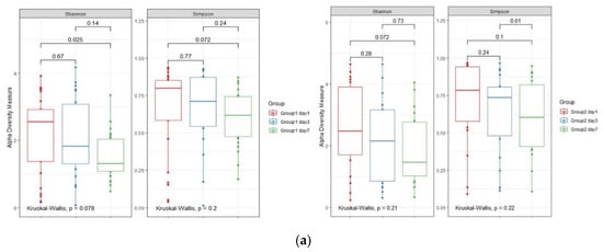 Changes in diversity over time differed between the successful extubation and failed extubation groups (Figure 3). The Shannon index significantly decreased between days 1 and 7 in the successful extubation group, but not in the failed extubation group. In addition, intra-individual Bray–Curtis dissimilarities between days 1 and 7 were significantly different in the successful extubation group, but not in the failed extubation group.