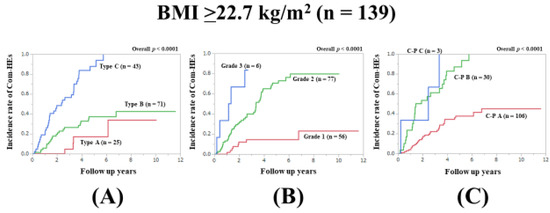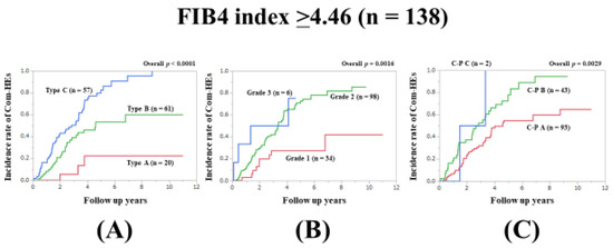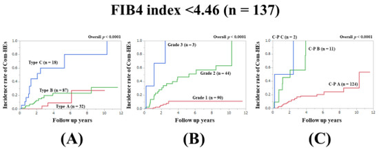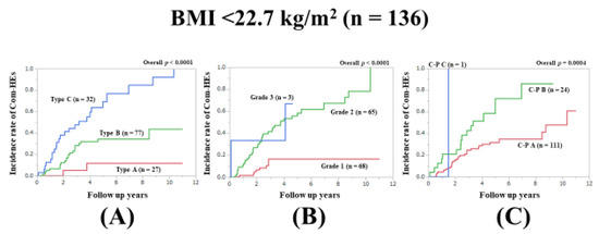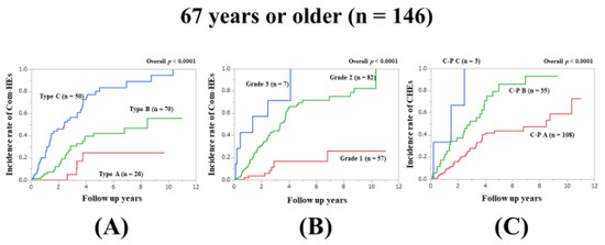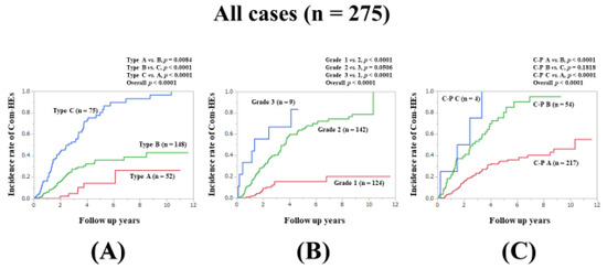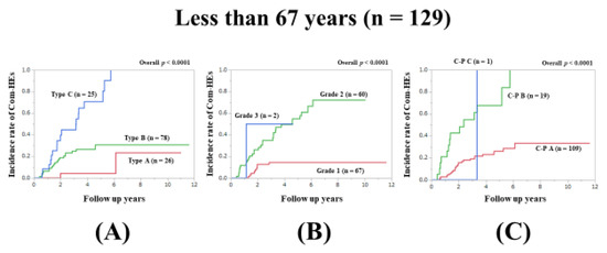The incidence of Com-HEs was our primary endpoint. The 3-, 5-, 7-, and 10-year cumulative incidence rate of Com-HEs was 4.83%, 14.21%, 26.47%, and 26.47%, respectively, in patients with type A; 27.48%, 35.76%, 38.68%, and 42.77%, respectively, in patients with type B; and 52.67%, 80.12%, 93.18%, and 96.59%, respectively, in patients with type C (p values: p = 0.0084 in type A vs. B, p < 0.0001 in type B vs. C, and p < 0.0001 in type A vs. C; overall p value < 0.0001) (Figure 1A).