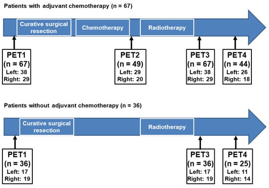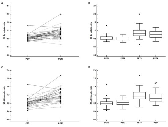 | Interval between RT and PET4 (days) | 357.4 ± 50.2 * | 363.6 ± 49.3 * | 0.605 | |