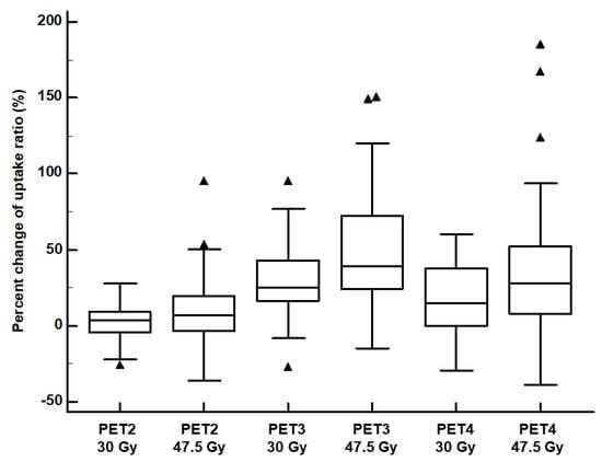 | Percent change in the 30 Gy uptake ratio (%) | - | 1.7 ± 11.5 | 28.7 ± 22.3 | 18.2 ± 23.3 |