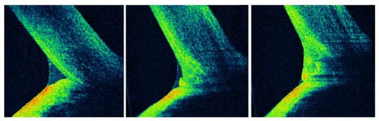 Traditionally, the structural details of the glands have been evaluated by biopsy or contact meibography, the former being clearly a drastically more invasive technique than the latter [82]. In recent years, OCT imaging of glandular tissue has been shown to be effective, leading to the growing diffusion of this contactless, in vivo, direct, reliable and patient-friendly technique [83,84,85,86]. Several authors have confirmed that meibomian glands can be optimally visualized using commercial OCTs and custom-built systems. Moreover, a good agreement between OCT meibography and traditional lid transillumination has been demonstrated by our group (Figure 9) [87].