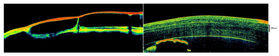 Another application of OCT imaging is represented by the evaluation of ocular surface tumors and their treatment. Several studies demonstrated that OCT may unveil a thickened, hyper-reflective epithelium (~390 µm), which switches abruptly from normal to abnormal appearance (strongly hyper-reflective), in ocular surface neoplasia [67,74,75,76]. Our group investigated the potential of OCT in detecting the changes inthe ocular surface after removal of pinguecula with an argon laser [77].