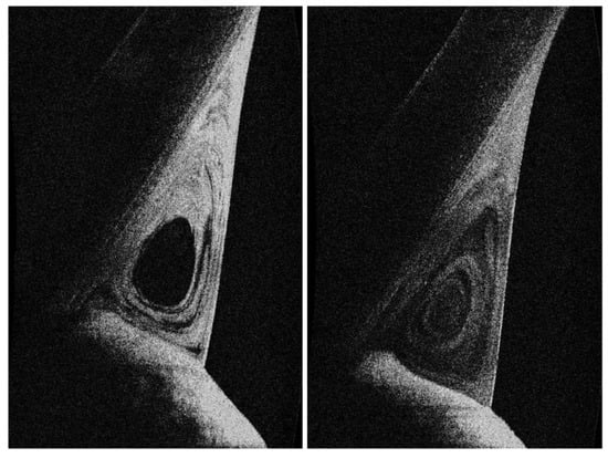 Napoli and co-workers have demonstrated the feasibility of applying a lipid-based tracer (castor oil) to OCT imaging to evaluate the clearance of human tears (in particular, the lipid tear turnover) (Figure 11) [102]. This chemical represents the first example of an OCT contrast agent having the quality to enhance the visualization of tear film dynamics. In this study, it was possible to track the flow of lipids in the lower tear meniscus and to recognize two main distribution patterns, i.e., the vortex type (in which a central area of poor reflectivity is surrounded by concentric areas of elevated reflectivity) and the homogeneous type (in which the meniscus reveals a similar reflectivity in each point, easily classified according to a reflectivity grading scale). Thus, the existence of centrifugal forces in the tear meniscus was demonstrated on the transverse plane. This implies that the “excretion of tear lipids” toward the lid skin occurs not only under conditions of overflow due to a large volume, but also because of a mechanism related to high fluid dynamics characteristics (turbulence of the menisci). In addition, a significant correlation between the tear turnover of lipids and the aqueous flow was found in healthy participants and in patients with dry eye or MGD, thus suggesting that some lipids regularly interact with some proteins (e.g., lipocalin) in the aqueous phase.