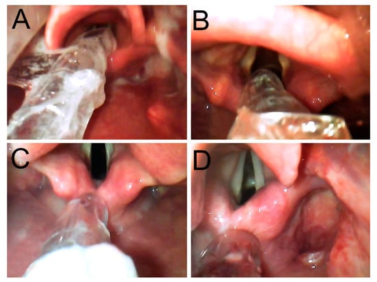 Alignment of nasotracheal tube tip with glottis inlet. The tip of the nasotracheal tube was positioned (A) at the center of the glottis inlet, (B) between the lower third of the posterior laryngeal wall and corniculate cartilage, (C) around the corniculate cartilage, and (D) between the posterior laryngeal wall and esophagus.