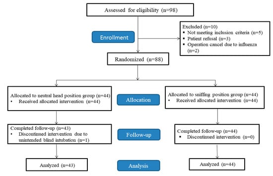 - Chung, Y.T.; Sun, M.S.; Wu, H.S. Blind nasotracheal intubation is facilitated by neutral head position and endotracheal tube cuff inflation in spontaneously breathing patients. Can. J. Anaesth. 2003, 50, 511–513. [Google Scholar] [CrossRef]