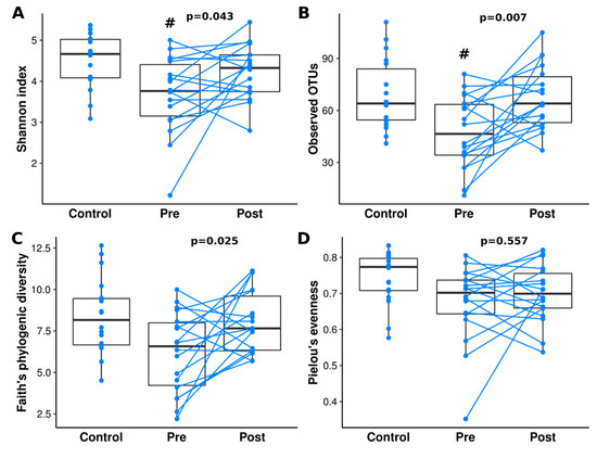 - Ott, S.J.; Musfeldt, M.; Wenderoth, D.F.; Hampe, J.; Brant, O.; Fölsch, U.R.; Timmis, K.N.; Schreiber, S. Reduction in diversity of the colonic mucosa associated bacterial microflora in patients with active inflammatory bowel disease. Gut 2004, 53, 685–693. [Google Scholar] [CrossRef] [PubMed]