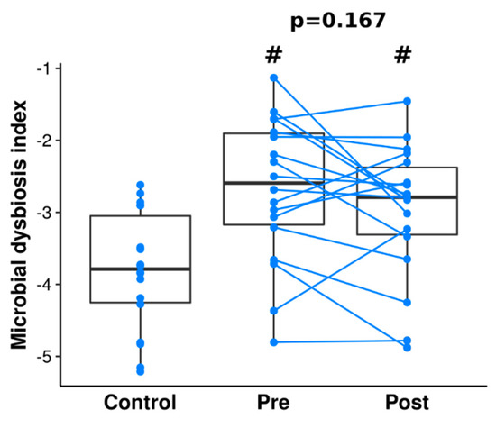 3.4. Gut Microbiome Differences and Dysbiosis between Groups