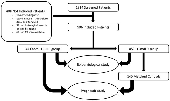 We first conducted an epidemiological study comparing LC-ILD and LC-noILD patients. Nine hundred and six patients were included, respectively 49 and 857. Controls were then matched to case subjects according to sex, cancer staging and histology. They were selected from among those included in the general comparative study described above. For each case, three controls were selected, excepted for two cases, for whom only two perfectly matched controls could be found. The study design is summarized in Figure 1.