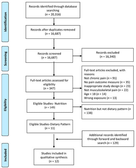 A flowchart giving a detailed overview of the study selection process can be found in Figure 1. From the initial search of the online databases, PubMed, Web of Science, and Embase, 20,316 potentially eligible articles were identified. After removing the duplicates, titles, and abstracts of 16,687 articles were screened and 347 articles were found eligible for full text screening. A total of 149 articles investigated the link between nutrition and chronic musculoskeletal pain conditions, of which 11 focused on overall diet analysis and dietary patterns. Backward and forward tracking resulted in one extra article. Finally, 12 articles were found eligible to be included in the present systematic review.
