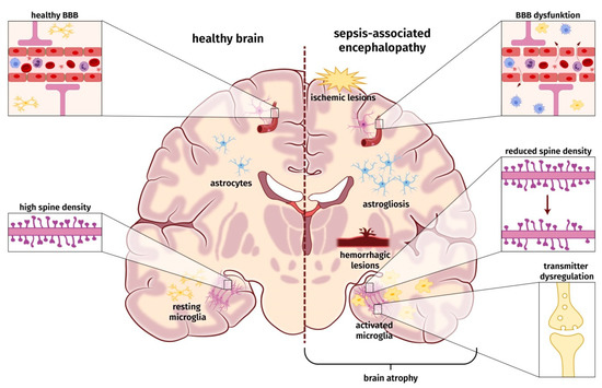 According to SAE definition, an acute infection of the CNS must be ruled out to diagnose SAE. Thus, SAE is regarded as a consequence of the dysregulated host response induced by severe systemic infection. So far, the pathophysiology and underlying molecular mechanisms leading to SAE are only incompletely understood. The etiology of SAE is likely multi-factorial, and a number of pathomechanisms are involved in parallel, influence each other, and contribute to a varying degree to the development of SAE [3]. These factors may involve ischemic/hemorrhagic lesions, a compromised blood–brain barrier (BBB), neuroinflammatory processes, e.g., microglia activation and astrogliosis, changes in neuronal synaptic spine density, and dysregulation of neurotransmitter (Figure 1). None of these factors seems to be obligatory to cause SAE.