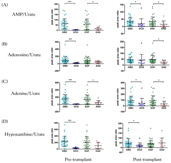 At the post-transplant stage, the ratios AMP/urate, adenine/urate and hypoxanthine/urate (q < 0.05) were significantly higher in the DBD group compared to the DCD group. Additionally, the scatter plot illustrated that the ratios AMP/urate, adenosine/urate and adenine/urate were elevated in the EGF group compared to the EAD one (q < 0.05).